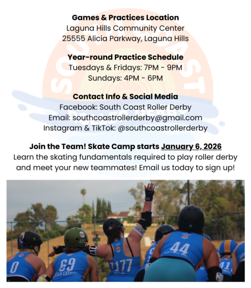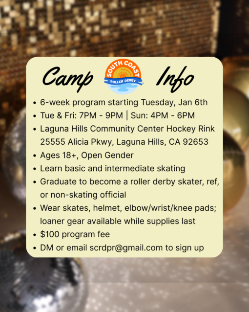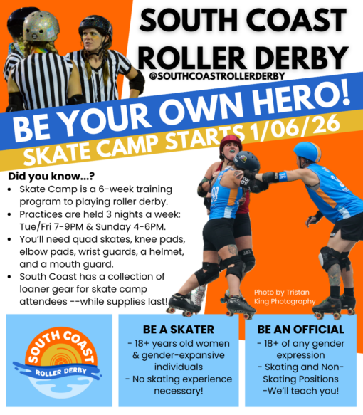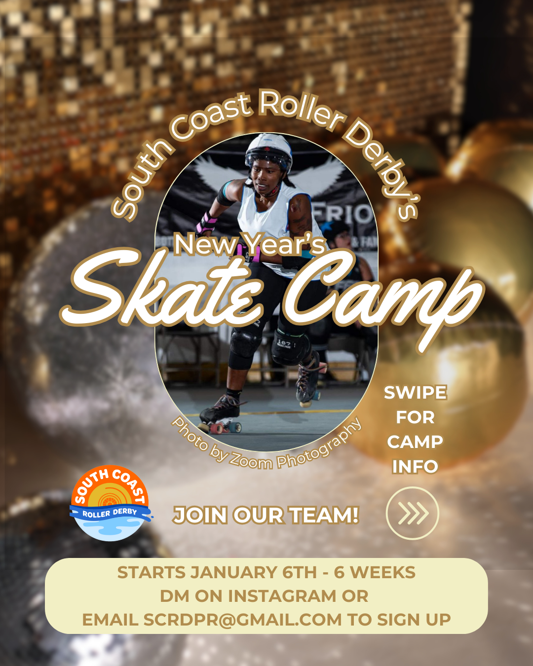 South Coast Roller Derby’s Skate Camp is the perfect way to turn your New Year’s resolution into reality! Learn to skate, build confidence, and discover the thrill of roller derby—all while making new friends for life!